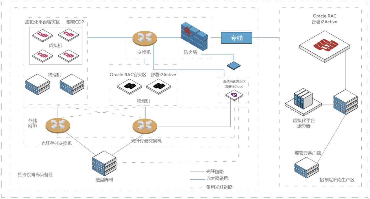 山东省招生考试院因行业特殊性,对数据的安全性以及保密性要求较高。为了保障数据的安全,将核心业务系统的重要数据通过1G 联通加固专线从济南灾备到310 公里之外的青岛联通安全隔离机房。本项目中要实时保护的数据包括: