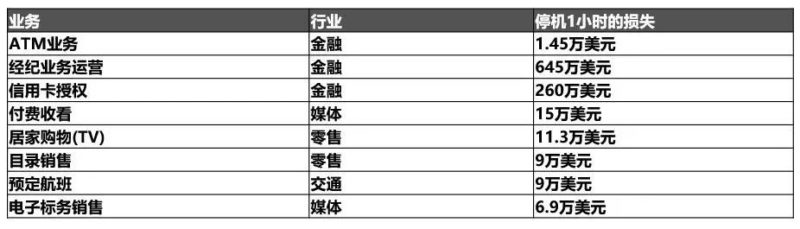 因为业务连续性是用户避免业务中断可能会给组织带来经济和声誉损失的首选策略,下面是业务中断1小时给出的损失参考金额。