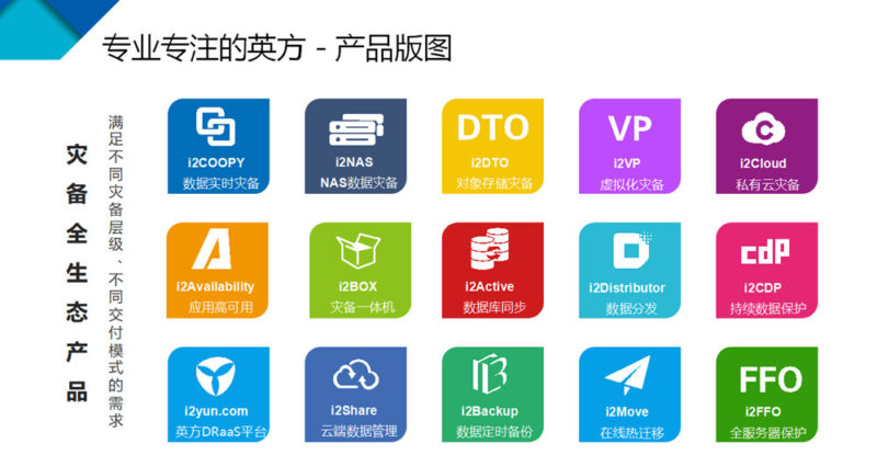 在灾备领域,以前再多的灾难损失的事件不发生在企业自身的都是故事,现在则不一样,除了越来越多的监管要求,数据作为重要的生产资料正在驱动企业对安全策略建设的积极性。英方在数据保护与业务连续性领域已经深耕多年,目前主要囊括了十五大技术产品和四大解决方案: