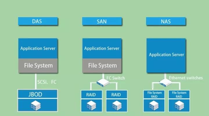 DAS存储一般应用在中小企业,与计算机采用直连方式;NAS存储则通过以太网添加到计算机上;SAN存储则使用FC接口,提供性能更加的存储。
