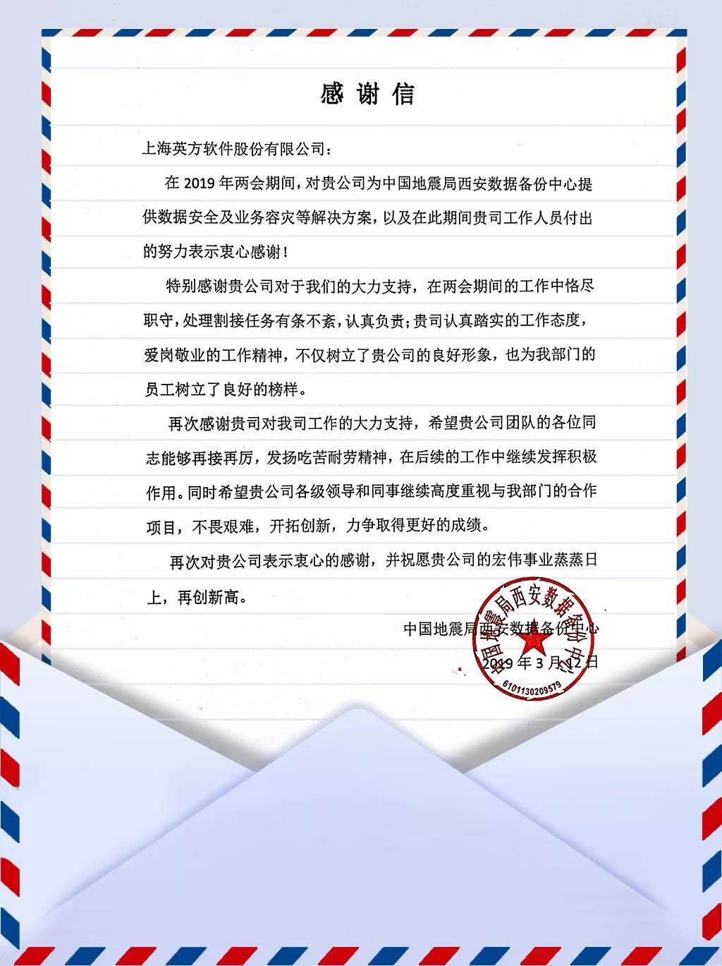 时值两会,英方凭借出色的产品与服务保障了中国地震局西安数据备份中心业务的正常开展,为此,中国地震局西安数据备份中心用感谢信的方式对英方的付出表示衷心感谢。