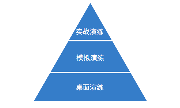 在灾备演练中,最常见的三种灾备演练方式分别是桌面演练、模拟演练和实战演练。它们的级别程度如下图金字塔所示:
