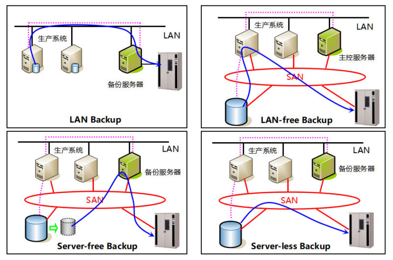 备份,简要的定义是指为防止系统出现操作失误、系统故障、网络病毒攻击、自然灾备等导致数据丢失,而将全部或部分数据集合从应用主机的硬盘或阵列复制到其它的存储介质的过程。在漫长的存储备份技术的发展过程中,衍生了Host、LAN、LAN-free、Server-free、Server-less等网络备份技术方案。这些方案根据需要备份数据量的多少,又可以分为全量备份、增量备份、差量备份。