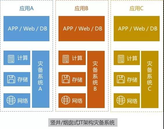 以上两种灾备价格是我们实际工作中经常会遇到的,但不管是双活还是两地三中心,在灾备方案设计的过程和部署过程中,因为原有业务的存在,经常会出现“专机专用”的现象,即不同业务系统需要不同IT架构予以配合,进而造成IT系统中 “竖井”林立,每个“竖井”又需要配备一个灾备系统,而这些灾备系统又总是需要单独安装、配置环境、数据初始化、监控运维等,不仅对运维人员的技能要求极为严格,而且人力成本极高。