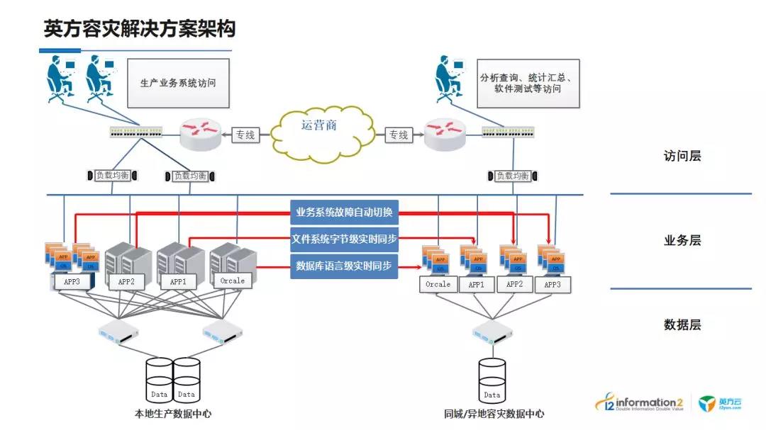 在数据层,操作系统、应用软件、软件配置复制,文件系统数据的同步复制,数据库实时双活复制三种复制方式,可以最大程度地保护客户的数据完整性和安全性。在业务层,英方的技术则可以通过复杂业务系统切换,来保证企业业务的连续性,并采用多种监控方式,实施业务切换。在访问层,则通过客户端访问层切换,实现故障切换。