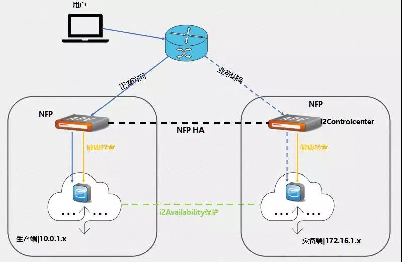 1)两个数据中心NFP设备做高可用模式部署,自动同步两端配置;