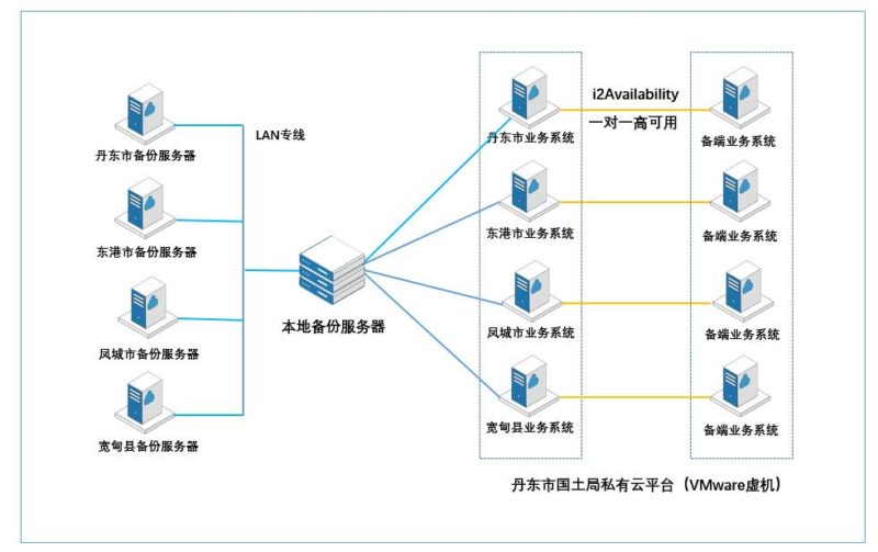 第一,利用丹东国土局私有云平台,在4台虚拟机(VMware)上部署丹东市、凤城、东港和宽甸四地的业务系统,同时利用云平台的另外4台虚拟机当作备端,部署备用业务系统,利用英方i2Availability高可用解决方案,形成一对一的应用接管。确保当生产端的任何一个生产系统出现故障时,备端能够马上接管起来。