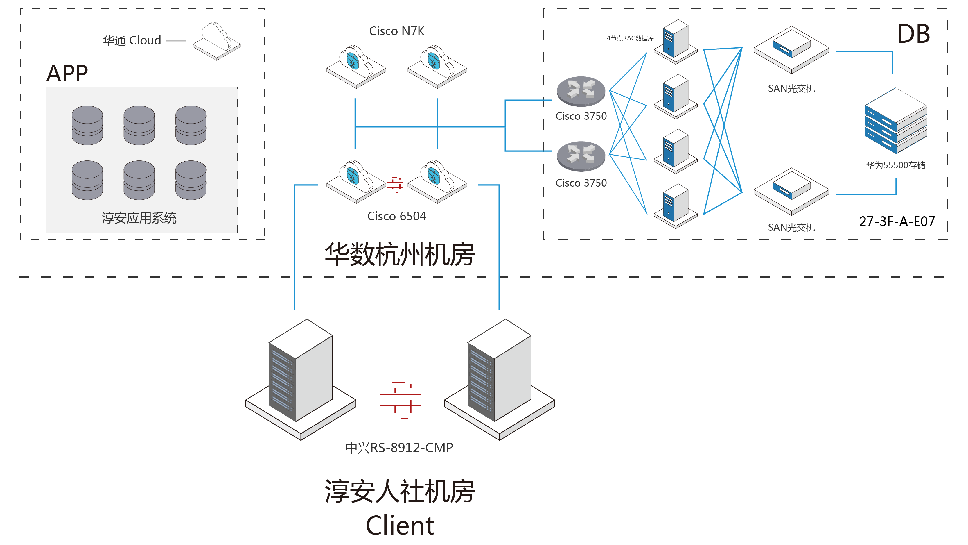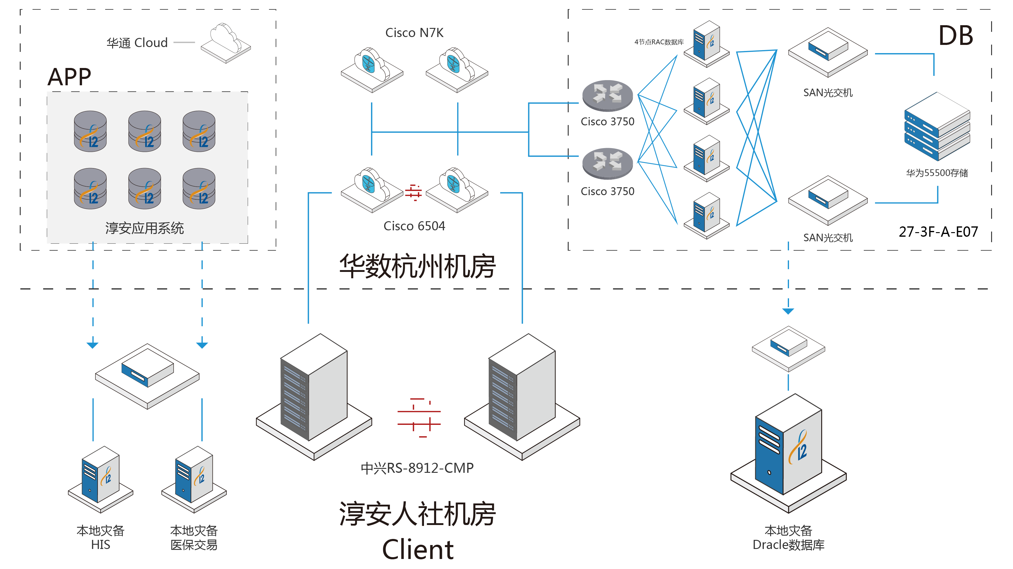 核心Oracle RAC数据库系统采用i2Soft i2Active数据库同步软件,分别部署在华数杭州机房数据库系统以及淳安人社机房数据库系统上,通过在线分析Oracle redo log方式获得交易语句和数据,完成schema或table级别的数据复制以及full database 级别的复制同时将数据灾备到淳安人社灾备Oracle数据库上.