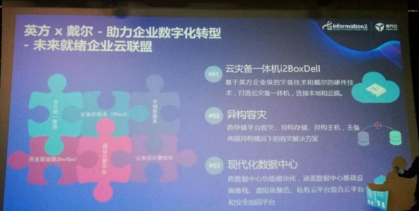 作为Dell发起的FRECO云联盟的创始成员,英方通过与戴尔在服务器、线下项目资源等领域的合作,为用户提供全面的异构灾备方案、云灾备一体机i2BoxDell、灾备级现代化数据中心等,助力企业数字化转型。