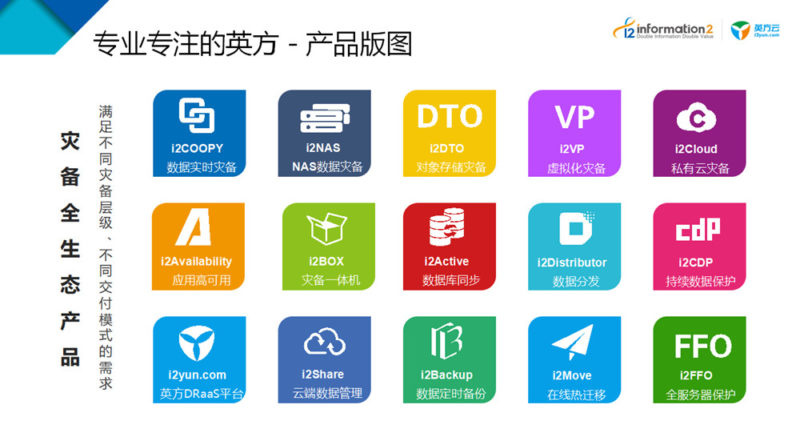 顺应云和大数据的灾备技术是英方在灾备行业的特征优势之一,在基于主机内核级的I/O复制技术基础上,英方拥有i2COOPY(数据实时灾备)、i2CDP(持续数据保护)、i2Move(在线热迁移)、i2Availability(应用高可用)、i2Distributor(数据分发)等业内领先的解决方案,与此同时,i2Active和i2NAS也已经享誉业界。