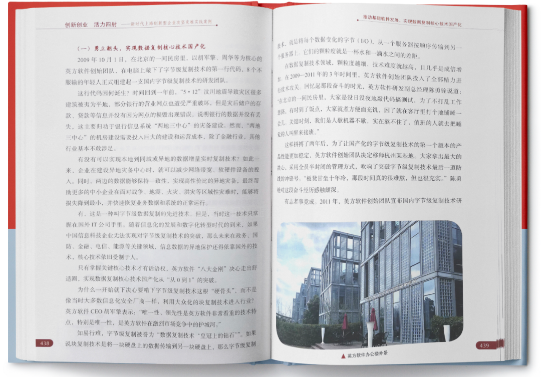 近期,由上海市委组织部、上海市教卫工作党委、上海科创办共同指导编写,列入上海市委党校(上海行政学院)重点教材的《创新创业 活力四射—新时代上海创新型企业攻坚克难实践案例》一书由复旦大学出版社出版发行。上海英方软件股份有限公司作为专注于数据复制的基础软件企业,经推荐及专家的评审,入选了本次的攻坚克难实践案例。