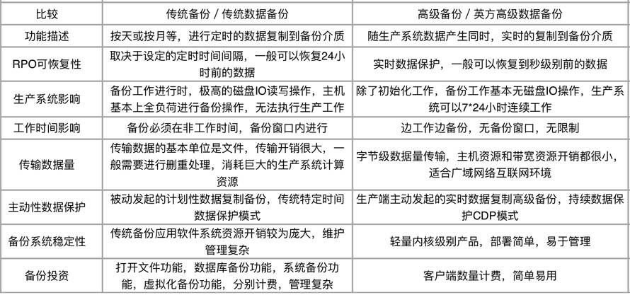 用户行为的传统备份建设,从RPO与RTO的参考标准看,与高级备份不在一个等级上,所以在描述两者之间的差别时,可以通过下面的图进行分析总结: