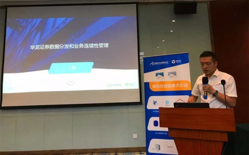 在峰会现场,华龙证券的王鹏作为客户代表,分享了华龙证券在数据分发和业务连续性管理的成功实践经验。他介绍了英方数据分发产品i2Distributor对上交所和深交所行情系统支持、快速分发等方面的特点。他同时提到,经过仔细的技术对比和方案甄选,华龙证券后期将采用i2CDP和i2Availability实现影像灾备系统和手机APP容灾系统的构建。