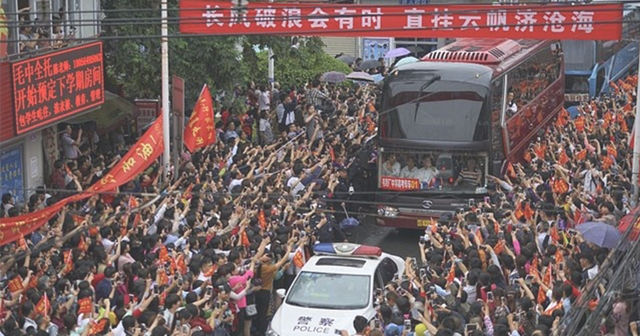 毛坦厂中学,一所被称为“亚洲最大高考工厂”的超级中学,6月5日,如期上演了一年一度的“万人送考”的大场面。28辆大巴车,近2万名考生,在现场1万多名送考人的欢呼声中向梦想出发。