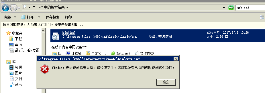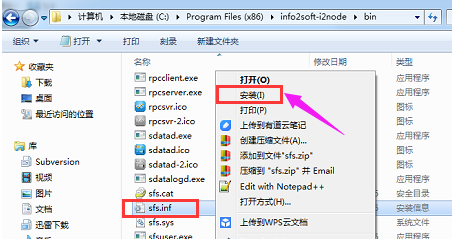 如果返回“指定的服务未安装”,则表示sfs未安装成功。此时需要手动尝试安装,在安装目录的bin目录下,找到 sfs.inf 文件,右键点击安装,进行手动安装。